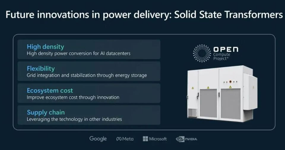 未来,这套系统还将进一步引入固态变压器(SST),进一步实现供电链路的精简化。它专为高功率密度的AI数据中心而设计,能够在更高效率下灵活接入电网与储能系统,并在负载剧烈波动时维持电网稳定。除原有的Mt. Diablo成员外,英伟达也加入了进来。各方希望通过联合创新,降低整体基础设施成本,并借助供应链复用,将该技术推广至更广泛的行业场景。