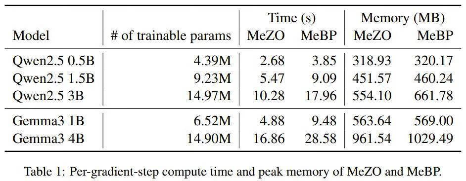 最近,苹果亲自上场,用一篇论文展示了其可行性。在这篇论文中,苹果提出了一种内存高效型反向传播(MeBP)。该方法可在内存使用量和计算时间之间提供比零阶优化(ZO/zeroth-order optimization)更好的权衡,同时还比 ZO 基线收敛更快、性能更优。他们还在 iPhone 15 Pro Max 上验证了 MeBP 的有效性。