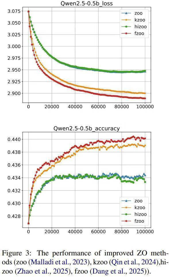 目前 AI 社区已经提出了几种方法,可以改善 ZO 方法的收敛速度。该团队也在 Qwen2.5-0.5B 上使用了这些改进版 ZO 方法进行实验,结果见下图。