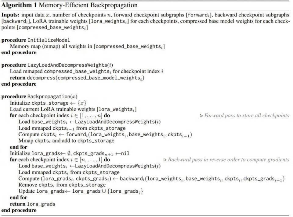 在每次前向和反向传播之前,只有必需的基础模型权重会被解压和加载。如此一来,总内存使用量被限制为:所需基础模型权重的大小,加上每个子图中操作的峰值内存使用量。这个总和远小于基础模型权重的完整大小。该函数描述的是单个数据点的梯度计算。对于批量输入,可以使用梯度累积来计算梯度,而不会增加内存占用。