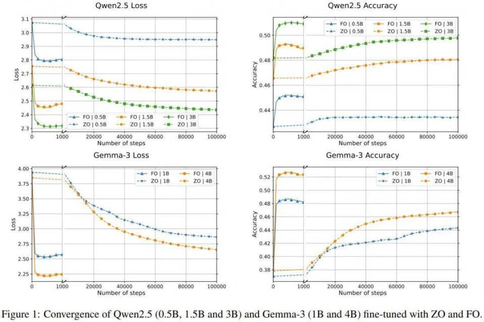 配置上,这个苹果团队使用了 Gemma-3 和 Qwen-2.5,在 WikiText-2 数据集上进行语言建模任务实验,以此比较一阶(FO)优化(即通过反向传播获得梯度)和零阶(ZO)优化的效用。该团队专注于参数量不超过 4B 的模型,因为移动设备的计算资源有限。该团队的评估指标是评估集上的损失(loss)和下一 token 准确度。其它配置见原论文,下面重点关注结果。