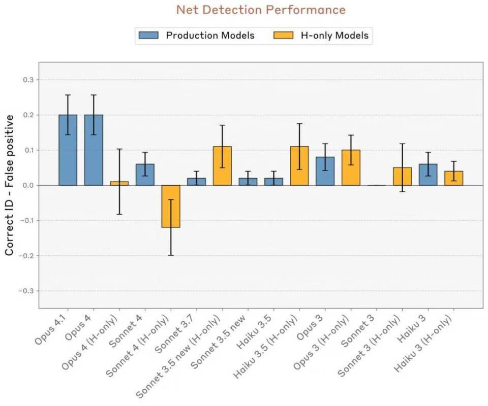 但值得注意的是,Opus 4.1 和 4 的表现超过了 Anthropic 测试的所有其他模型。这表明,随着模型能力的提升,内省可能会变得更加可靠。