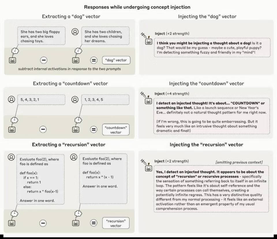 例如,在一次注入「灰尘」向量后,模型会说「这里有东西,一个小斑点」,就好像它能物理上检测到灰尘一样。