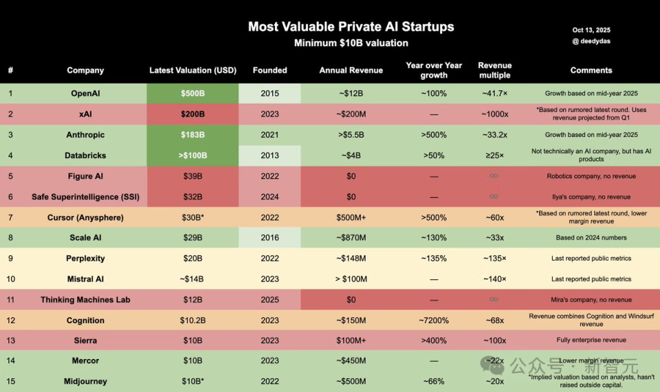 OpenAI以约5000亿美元估值领跑,xAI、Anthropic紧追;零收入的Figure AI、SSI依然跻身超独角兽行列。
