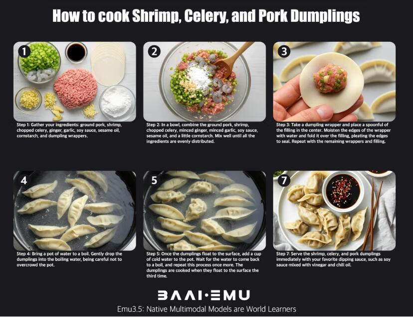 Emu3.5 的多模态指导能力:输入“如何做芹菜饺子”,模型输出有步骤的图文指导