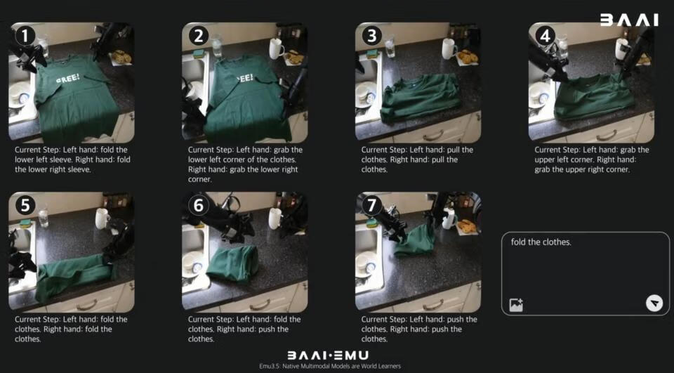 只需一句“叠衣服”的简单指令,Emu3.5便能自主规划、拆解任务,并精确生成机器人完成一整套复杂的折叠动作