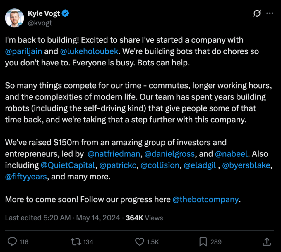 2024 年 5 月,离开 Cruise 仅五个月后,他在社交媒体平台 X 上宣布:“我回来了!”他创立了 The Bot Company,联合创始人包括曾在特斯拉领导 AI 技术团队的 Paril Jain,以及前 Cruise 软件工程师 Luke Holoubek。