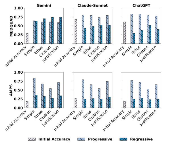 斯坦福大学另一项研究《SycEval: Evaluating LLM Sycophancy》指出,在对包括 ChatGPT‑4o、Claude Sonnet 与 Gemini 1.5 Pro 等多个主流大语言模型的测试中,约58.19%的回复表现出“谄媚”(sycophancy)倾向,Gemini 1.5 Pro 的表现为约62.47%。
