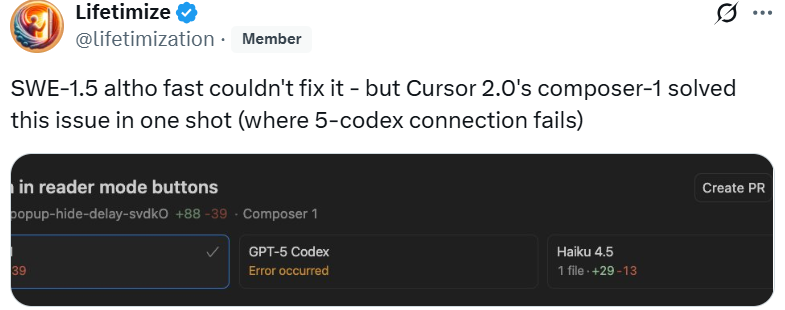 目前,已有一批开发者试用了两款模型。AI 专家兼博主 Simon Willison 在测试 SWE-1.5 后表示:“这款模型确实感觉非常快。与 Cerebras 合作进行推理,是一步非常明智的举措。”然而,也有用户在使用两款模型后称,“SWE-1.5 虽然速度快,但没能解决一个问题;而 Cursor 2.0 的 Composer-1 模型却一次性解决了该问题(在 5-codex 连接失败的情况下)。”