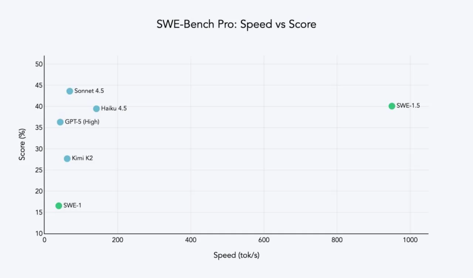 值得一提的是,据公开介绍,Composer 的生成速度达到每秒 250 个 token,而 SWE-1.5 的处理速度最高可达 950 token / 秒,是前者接近 4 倍。