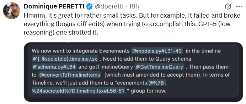 此外,还有用户反馈,“(SWE-1.5)它在处理小型任务时表现确实不错。但比如在尝试完成某项任务时不仅失败了,还搞砸了所有东西(出现了无效的差异编辑),而 GPT-5(低推理版本)一次就成功完成了。”