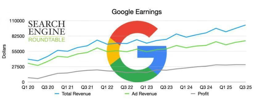 图注:谷歌搜索2020-2025三季度的广告收入与总收入走势对比
