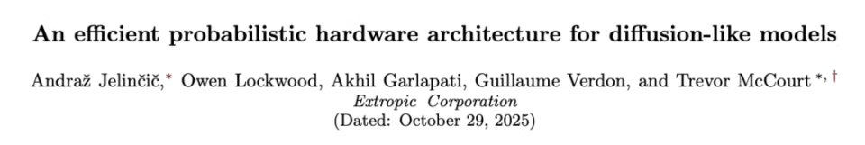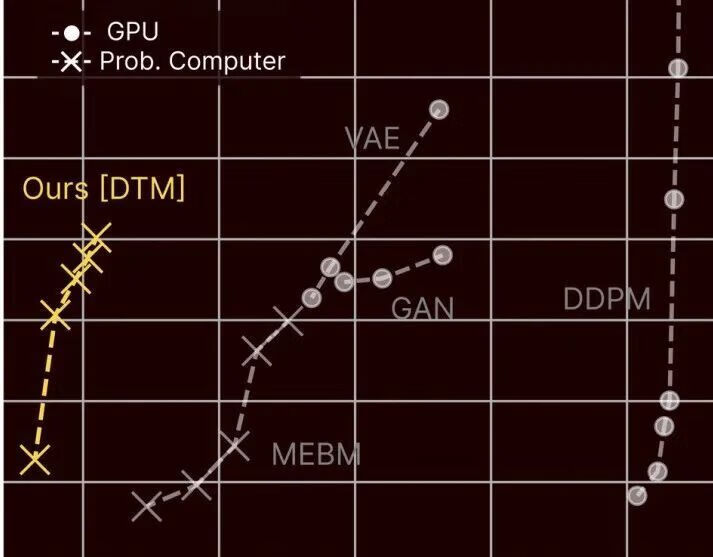 根据 Extropic 于 2025 年 10 月 28 日在学术预印本网站 arXiv 上发布的论文《一种用于类扩散模型的高效概率硬件架构》(An efficient probabilistic hardware architecture for diffusion-like models),其设计的全晶体管概率计算机,在运行他们提出的“去噪热力学模型”(Denoising Thermodynamic Model,DTM)时,相较于在 GPU 上运行的同类算法,能在达到同等性能水平(performance parity)的前提下,将能耗降低约 10,000 倍。