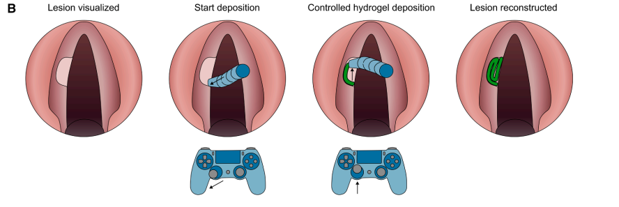 实验技术报告显示,通过 MIISB 打印头,水凝胶被成功地沉积到人造声带模型上的模拟缺陷区域,如声带沟(sulcus)和病灶切除后的空腔,用以重建组织的几何形状。对这一步精确度的高要求,目的在确保水凝胶能够植入到声带的浅层固有层——这是负责发声振动的关键组织层。