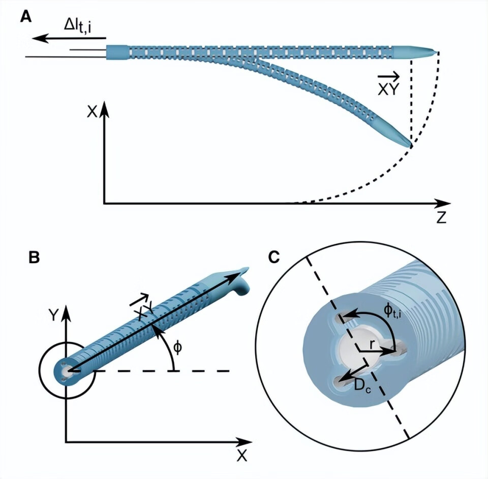 除了足够微小外,MIISB 打印头在灵活度上也十分出色。研究团队受启发于自然界中的灵活结构,特别是大象的鼻子,设计出了它的独特结构——不是依赖于刚性的铰链或关节,而是通过内部集成的三根独立驱动缆线来操纵柔性臂的弯曲和延伸,从而在三维空间内定位喷嘴。这种运动机制使得设备能够在声带这一高度弯曲和深藏的区域实现操作。
