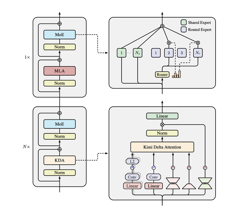 Kimi Linear 模型架构示意图。该模型由一系列堆叠的模块组成,每个模块包含一个 token 混合层(token mixing layer),其后接一个 MoE 通道混合层(channel-mixing layer)。