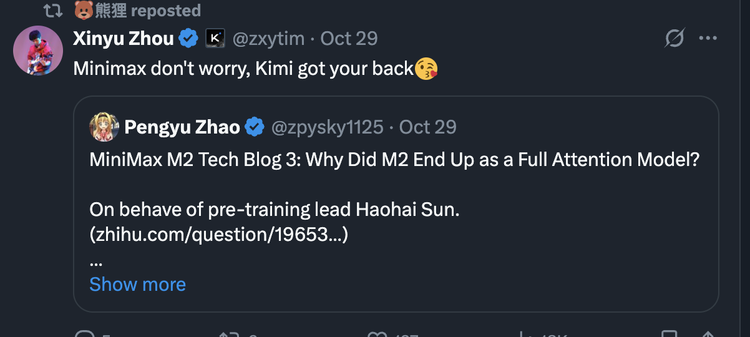 10月29日,月之暗面研究员周昕宇(Zhou Xinyu)在X上转发了MiniMax M2 Tech Blog的推文,并评论道:“Minimax don't worry, Kimi got your back 😘”。不仅如此,他还在知乎的同一篇博文下留下了同样的评论,这种带有调侃意味的公开“示好”,既像挑逗,也像挑衅。