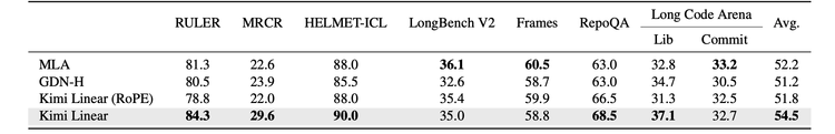 第三个是No Position Encoding (NoPE)。Kimi Linear的MLA层不使用位置编码(如RoPE),所有的位置信息完全由KDA层负责。这个设计带来三个好处:推理效率更高(MLA可以转换为更高效的MQA)、训练更简单(避免了RoPE参数调整)、长上下文泛化更好。
