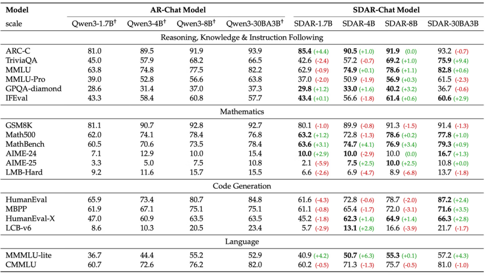 研究人员基于 Qwen3 系列的 1.7B、4B、8B-dense 和 30B-A3B MoE 模型,通过「继续预训练 (CPT) + 指令微调 (SFT)」的两阶段流程,训练出 SDAR-Chat 系列模型,并与采用完全相同流程训练的 AR-Chat 基线进行全面对比。