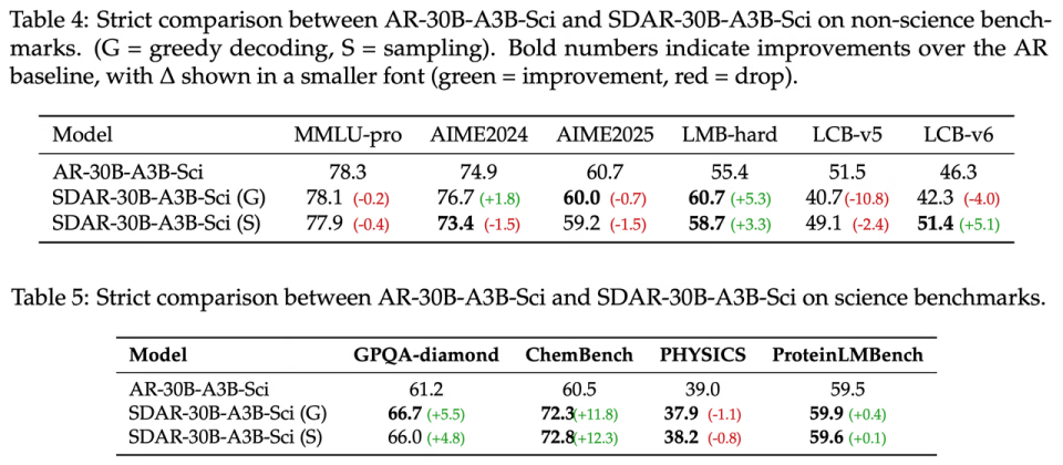 图注:AR-30B-A3B-Sci and SDAR-30B-A3B-Sci 性能比较