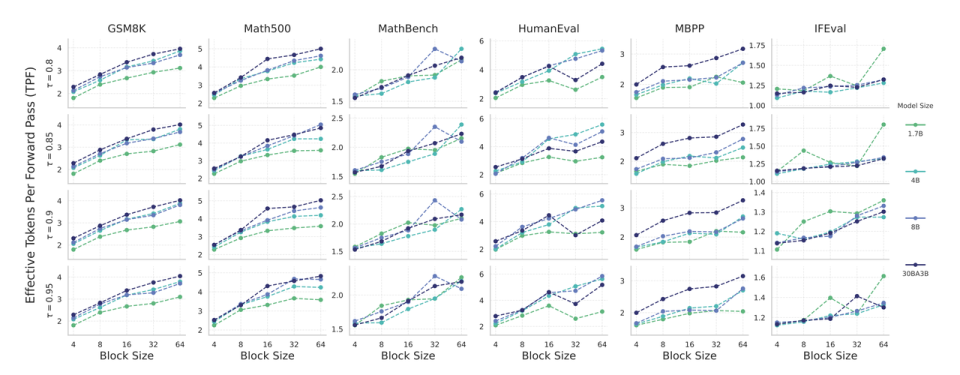 模型越大,加速越明显:更强的模型预测更自信,能一次性并行生成更多 token,实现更高的 TPF,形成「能力与速度」的良性循环。