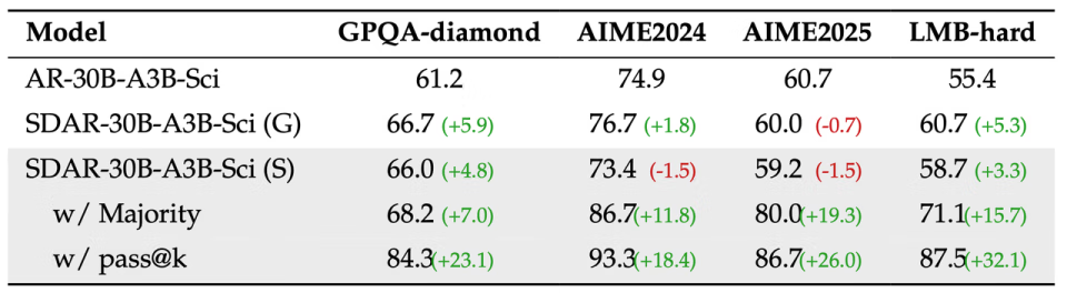 除了效率提升,一个自然而然的问题是:SDAR 独特的生成机制是否会影响其复杂的推理能力?为此,研究人员基于 Qwen3-30B-A3B,专门打造了一款科学推理模型 SDAR-30B-A3B-Sci,并与严格对齐训练流程的 AR 版本进行对比,结果令人振奋。