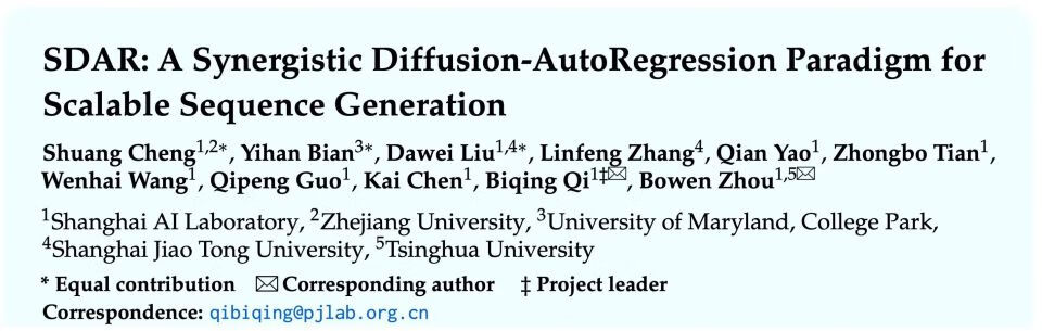 近日,上海人工智能实验室针对该难题提出全新范式 SDAR (Synergistic Diffusion-AutoRegression)。