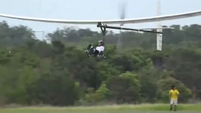 再比如日本学生制造并试飞了一架人力驱动的飞行自行车。它装有巨大的机翼,后方配有一台大型螺旋桨。螺旋桨与脚踏系统相连,骑手在踩动踏板时便能驱动它旋转。