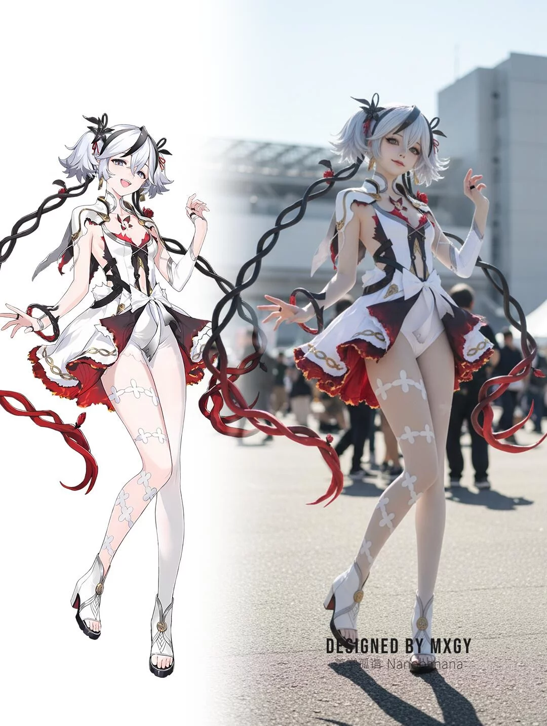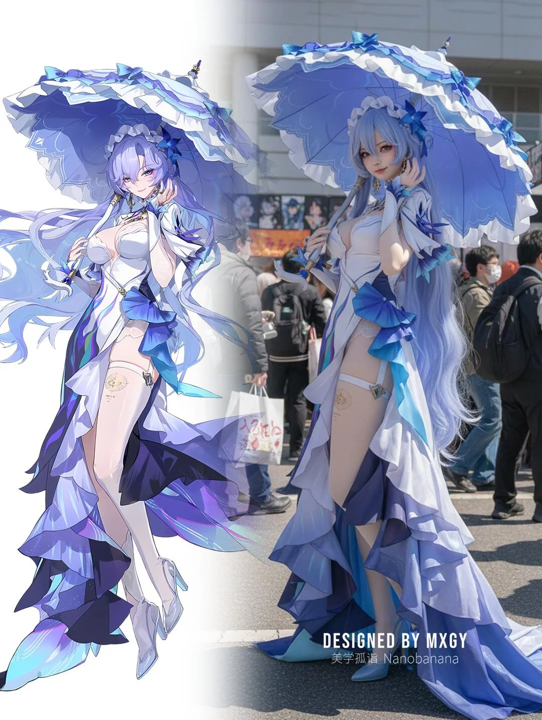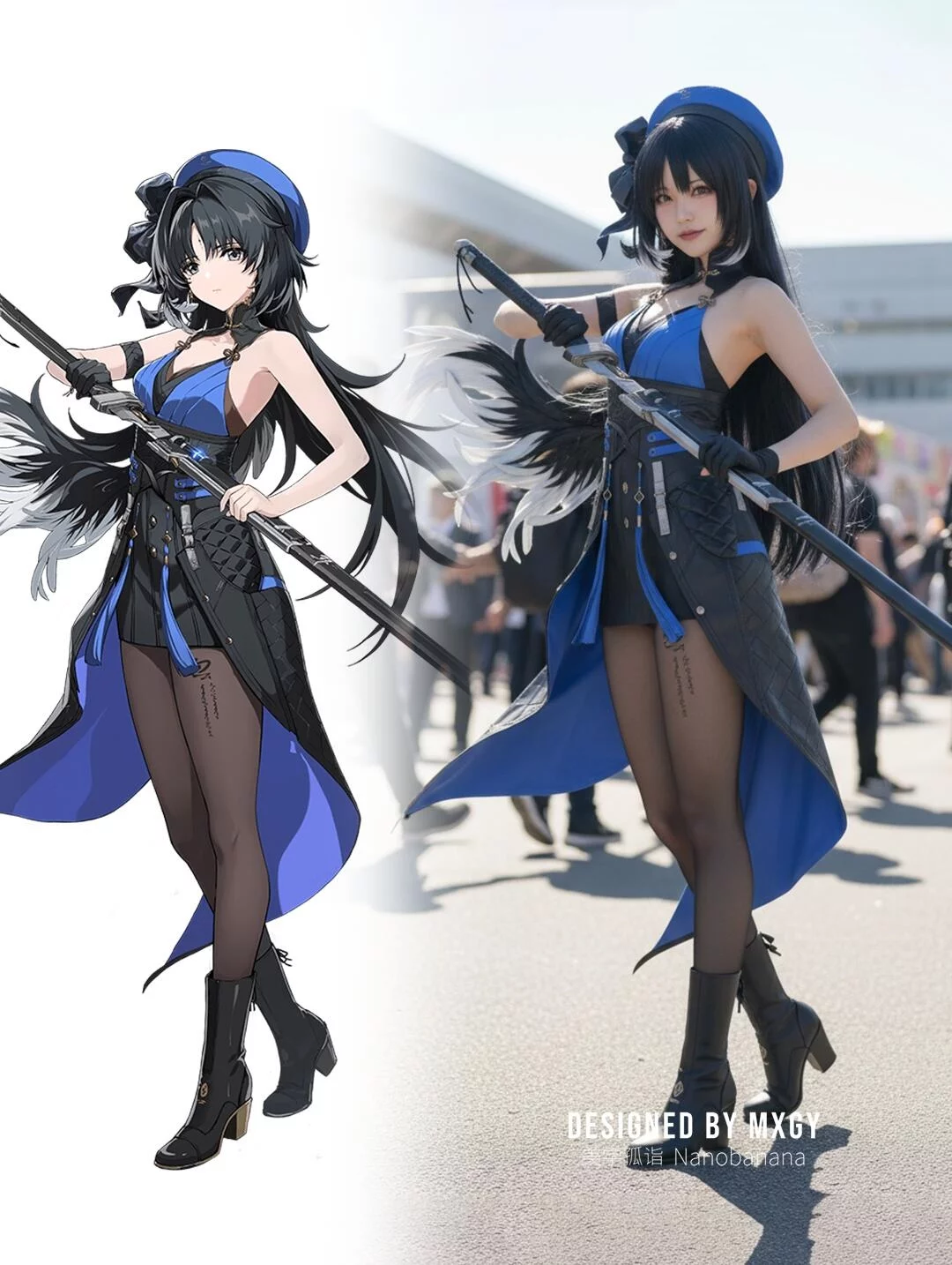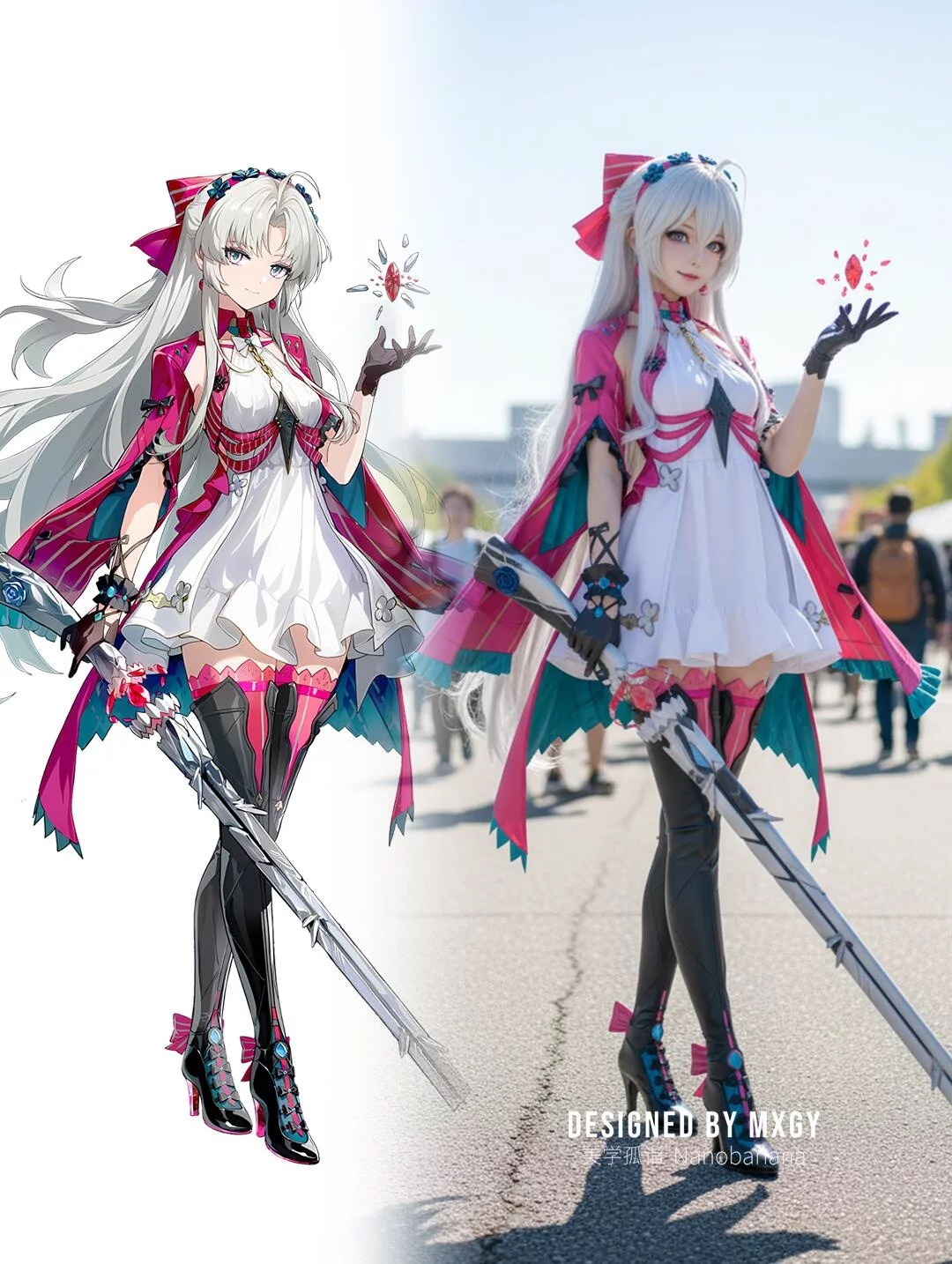提示词:Generate a photo of a cosplayer dressed in the costume of the illustrated character, posing with the action of the character in the picture, with exquisite makeup, set in an anime exhibition, outdoors, under strong sunlight.