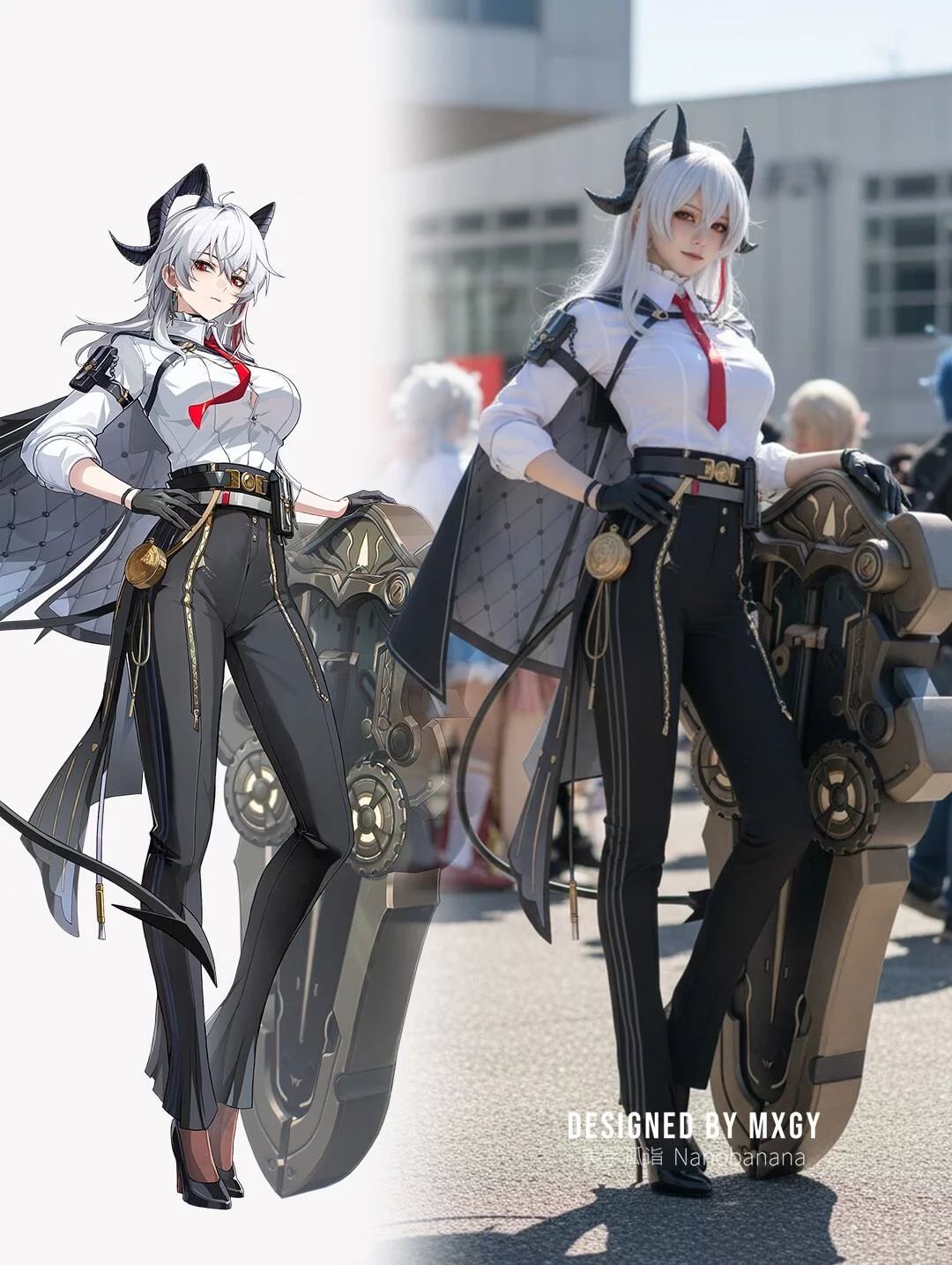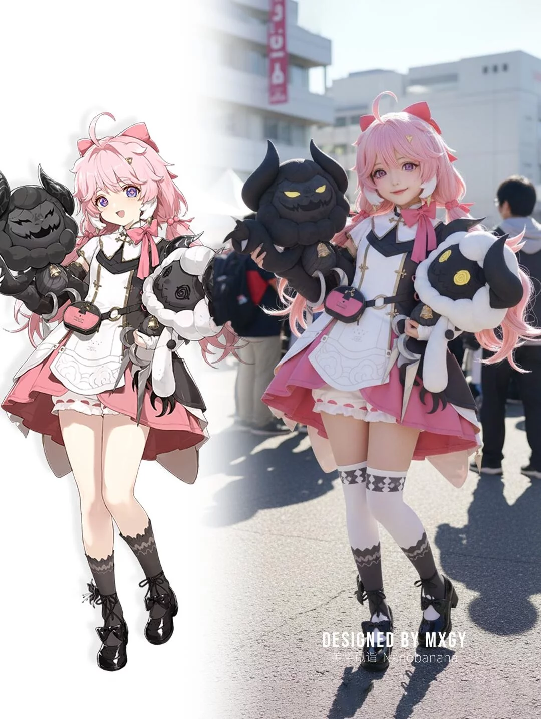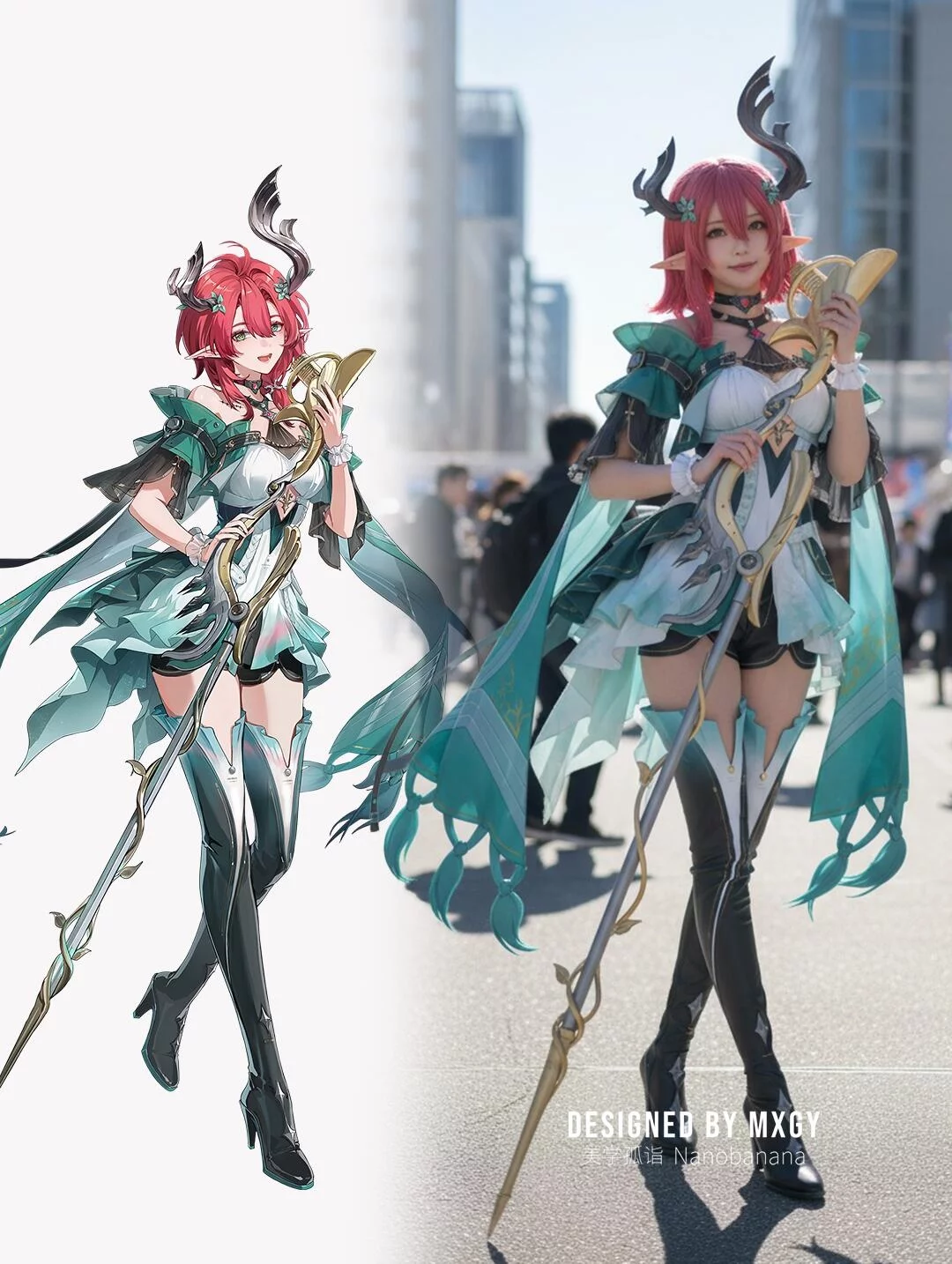 提示词:Generate a photo of a cosplayer dressed in the costume of the illustrated character, posing with the action of the character in the picture, with exquisite makeup, set in an anime exhibition, outdoors, under strong sunlight.
