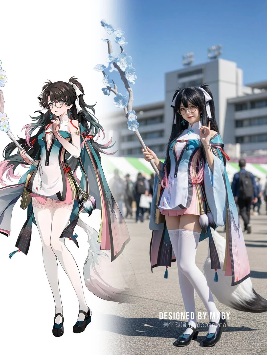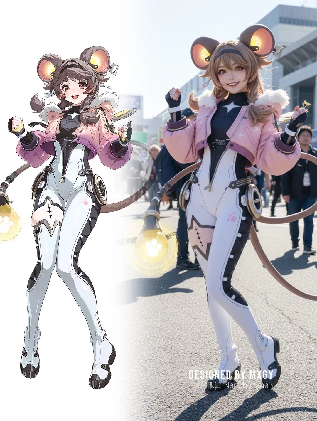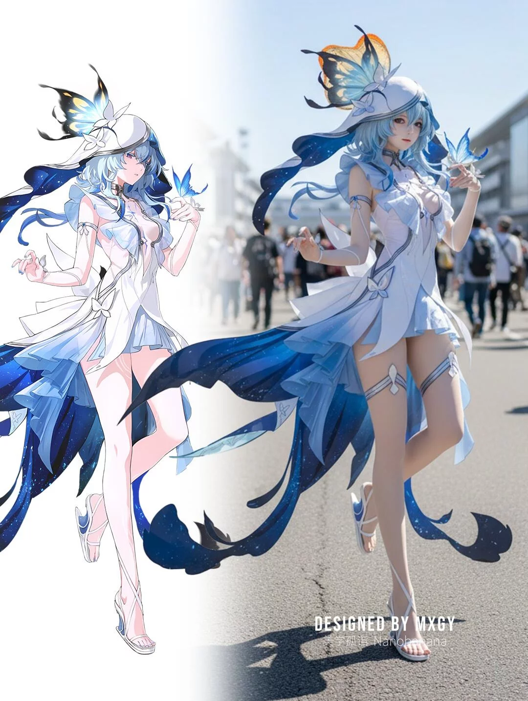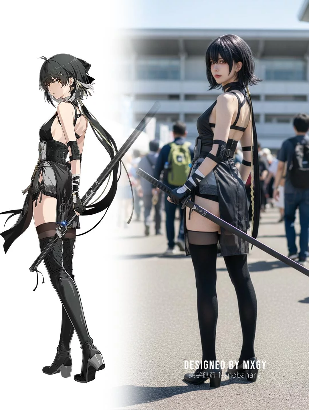 提示词:Generate a photo of a cosplayer dressed in the costume of the illustrated character, posing with the action of the character in the picture, with exquisite makeup, set in an anime exhibition, outdoors, under strong sunlight.