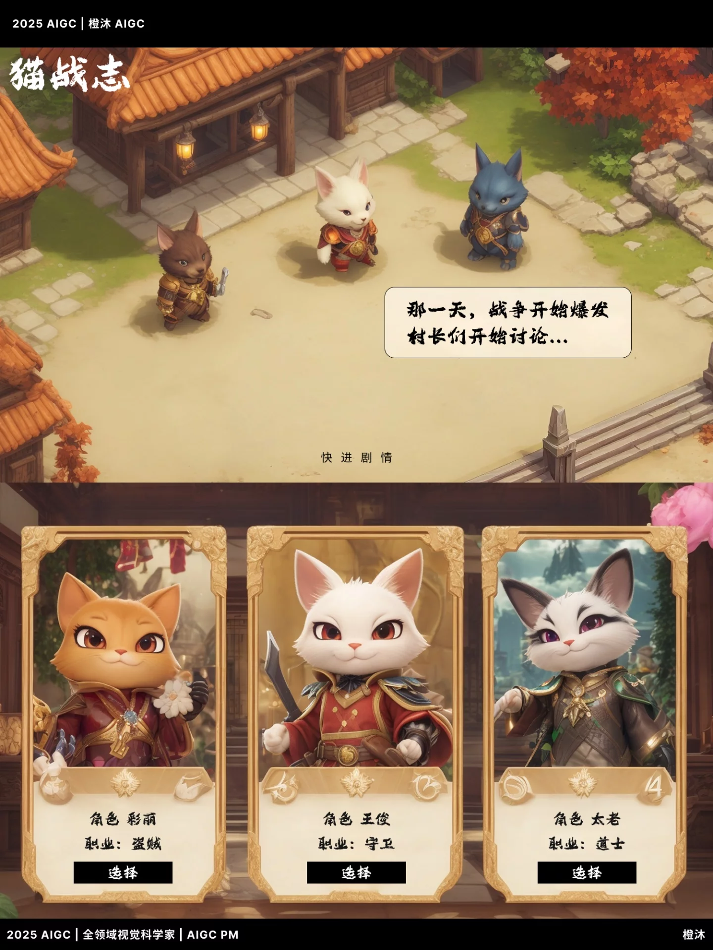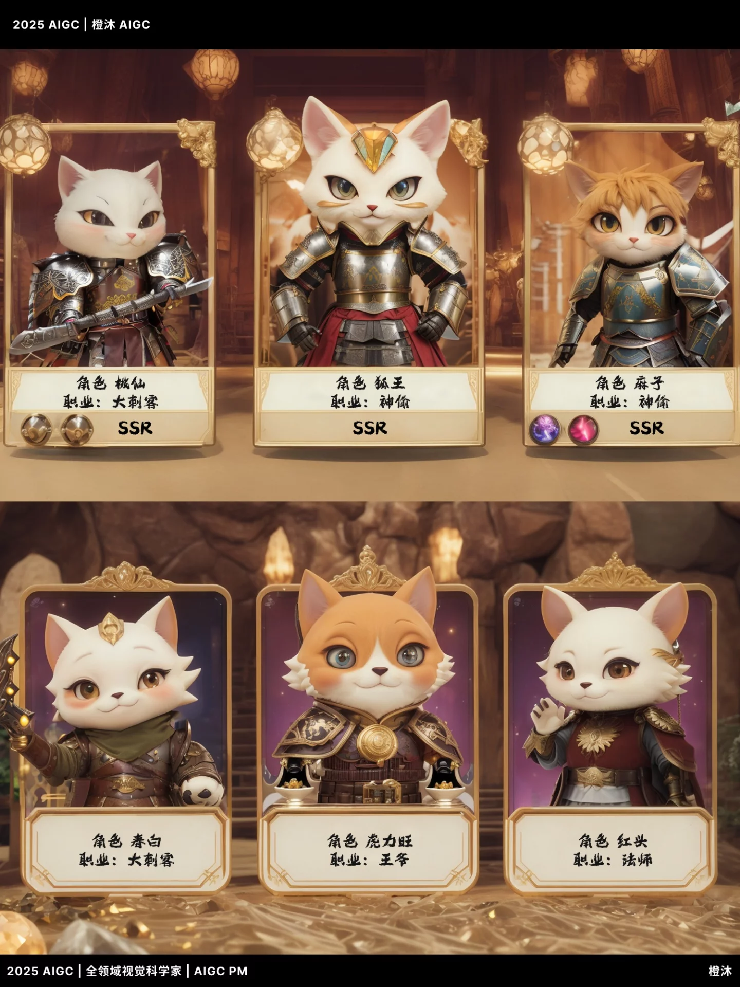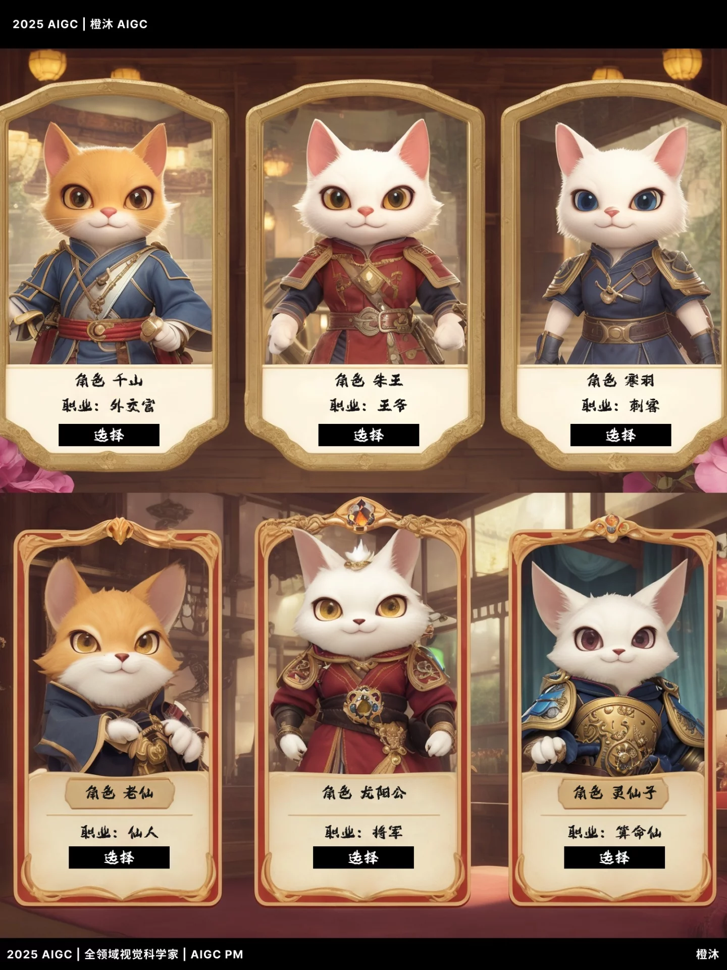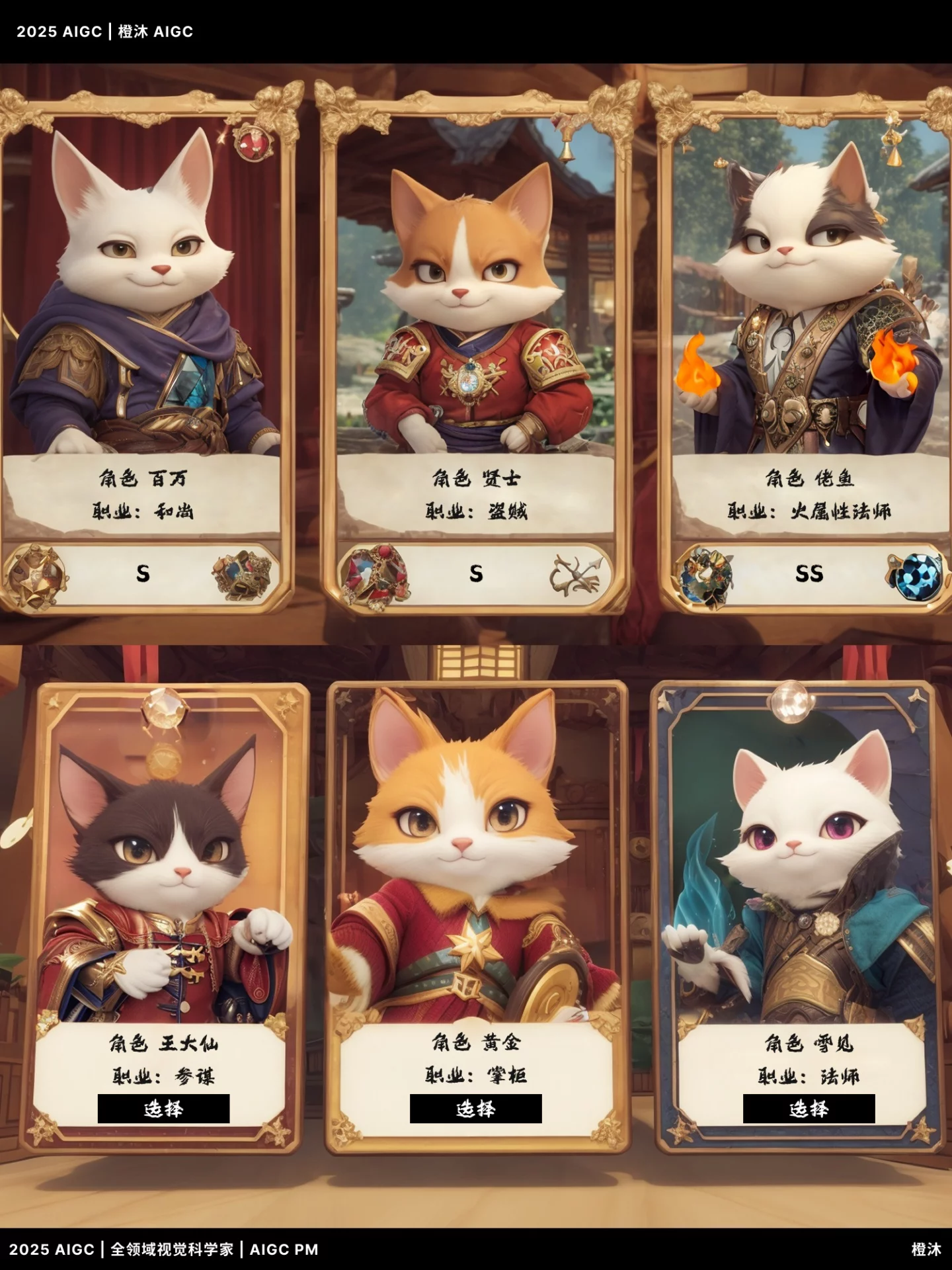 在不到一天内,我运用 AIGC 技术完成了超过 50 张《猫战志》角色卡牌的原型生成,建构出完整的剧情导引、角色分类、等级稀有度、职业逻辑等系统结构。更重要的是,它不仅是一套“美术图”,而是一次
