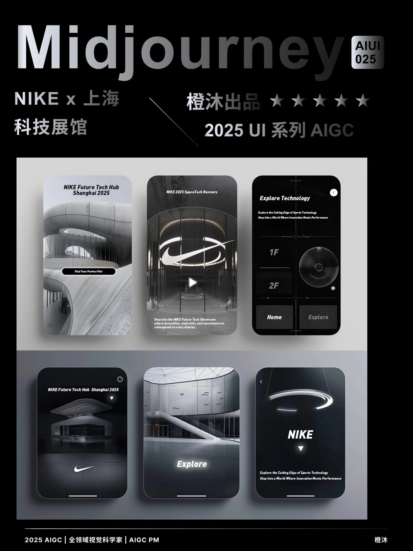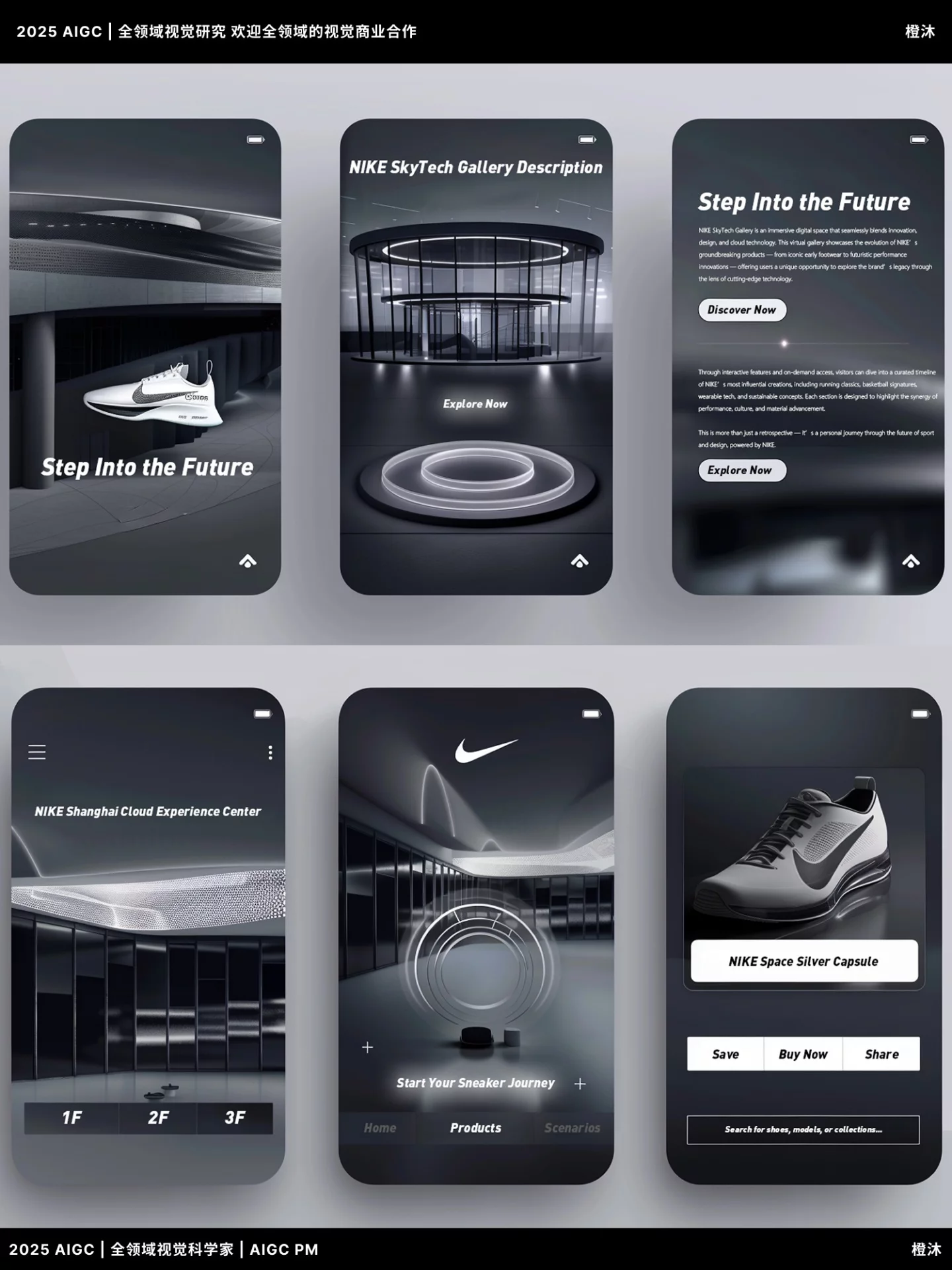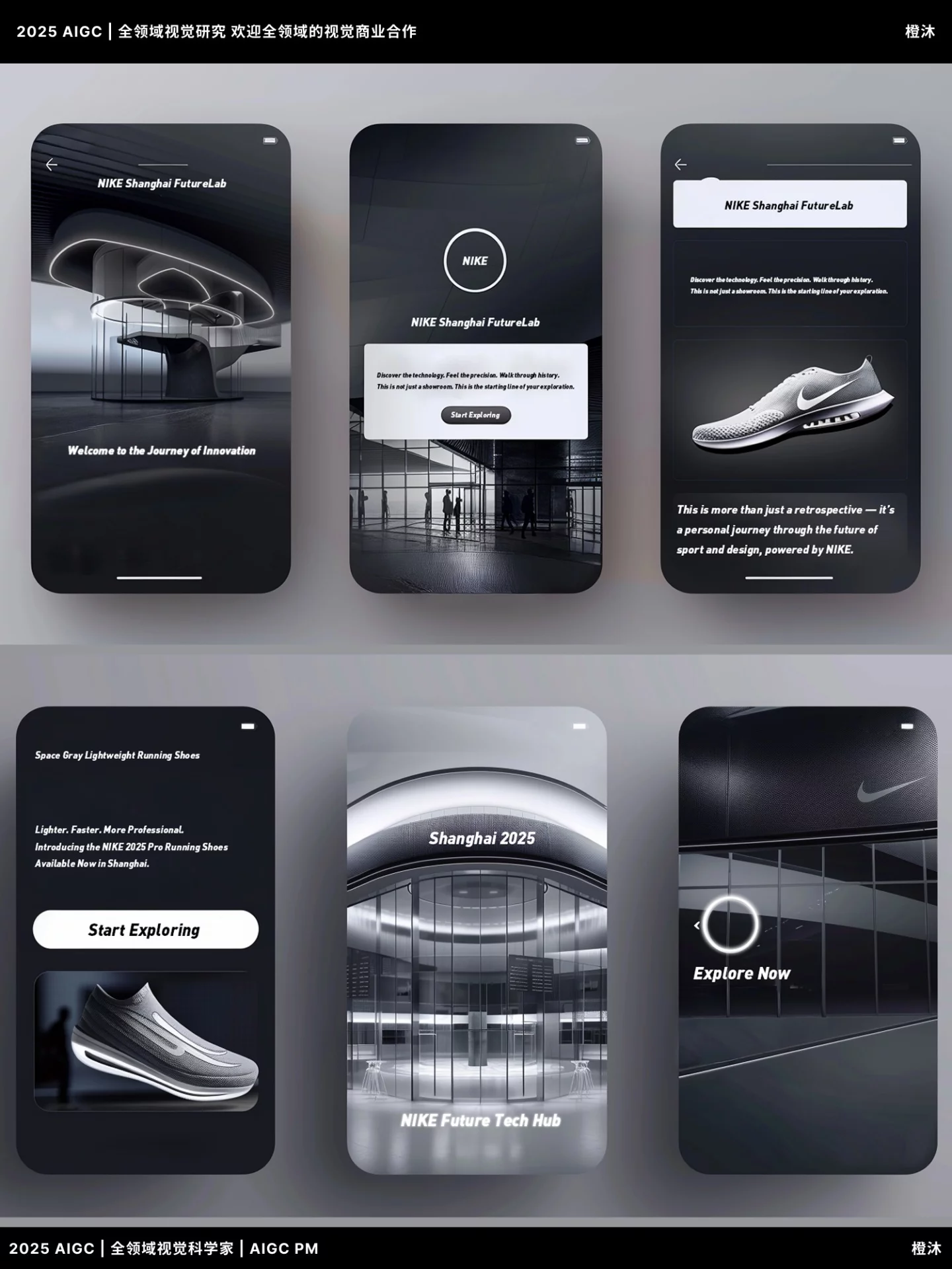 这组《NIKE Future Tech Hub》作品,是我基于 AIGC 图像生成能力所进行的一次跨领域视觉原型研究,聚焦于未来运动品牌场馆的构图机制、UI 语言及数字交互结构,并尝试在「建筑空间 × 品牌系统 × 科技感知」三者之间,建立一套可应用的视觉模型。