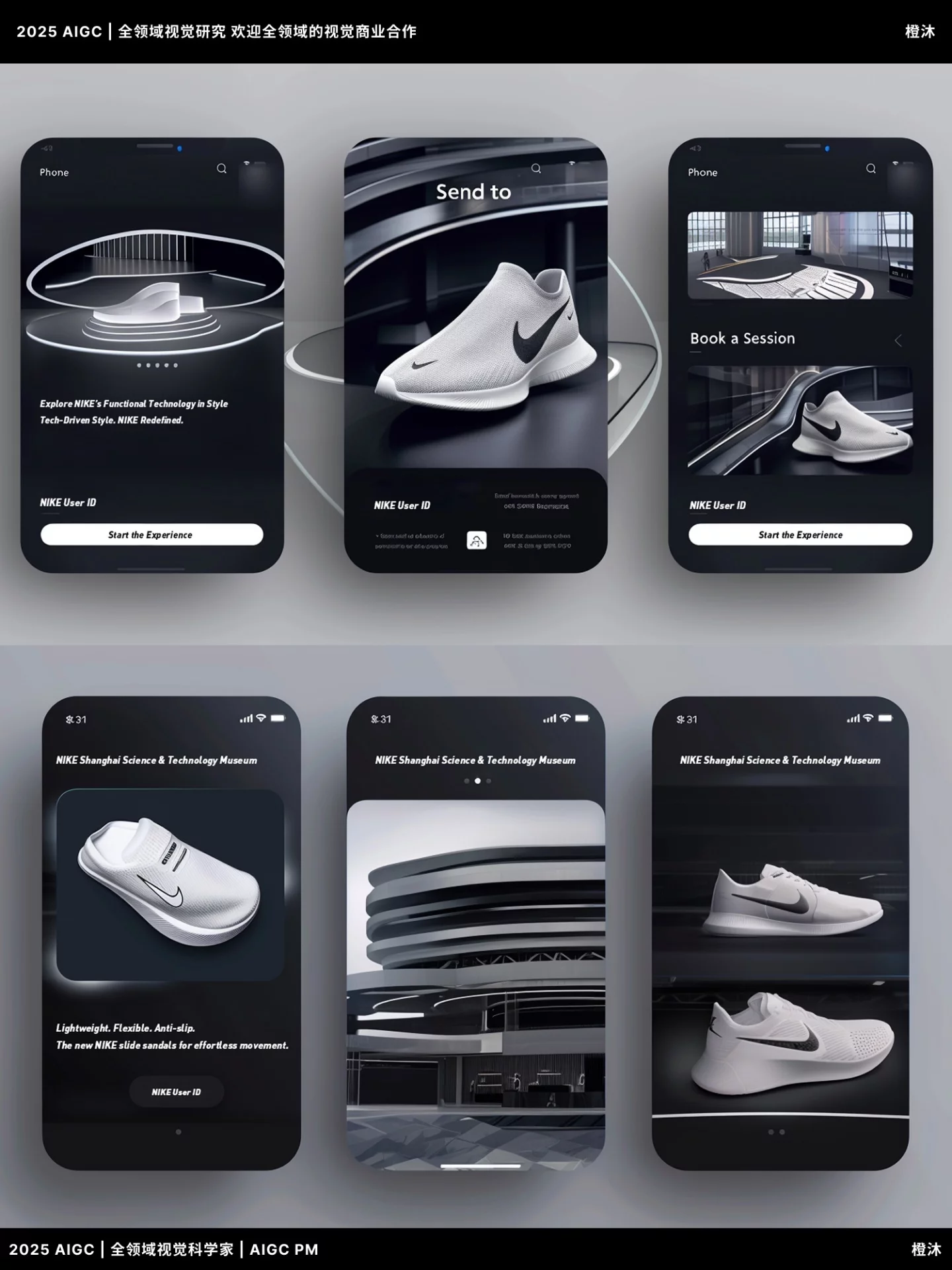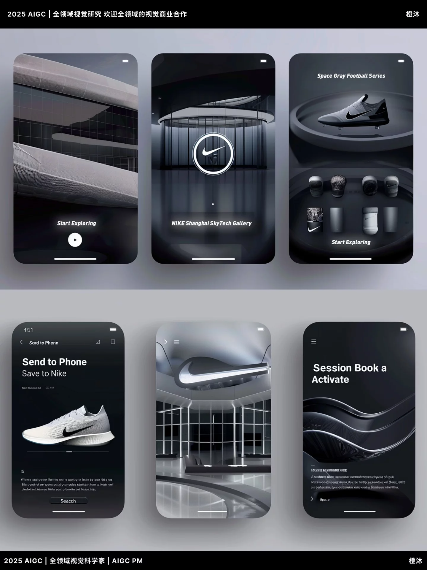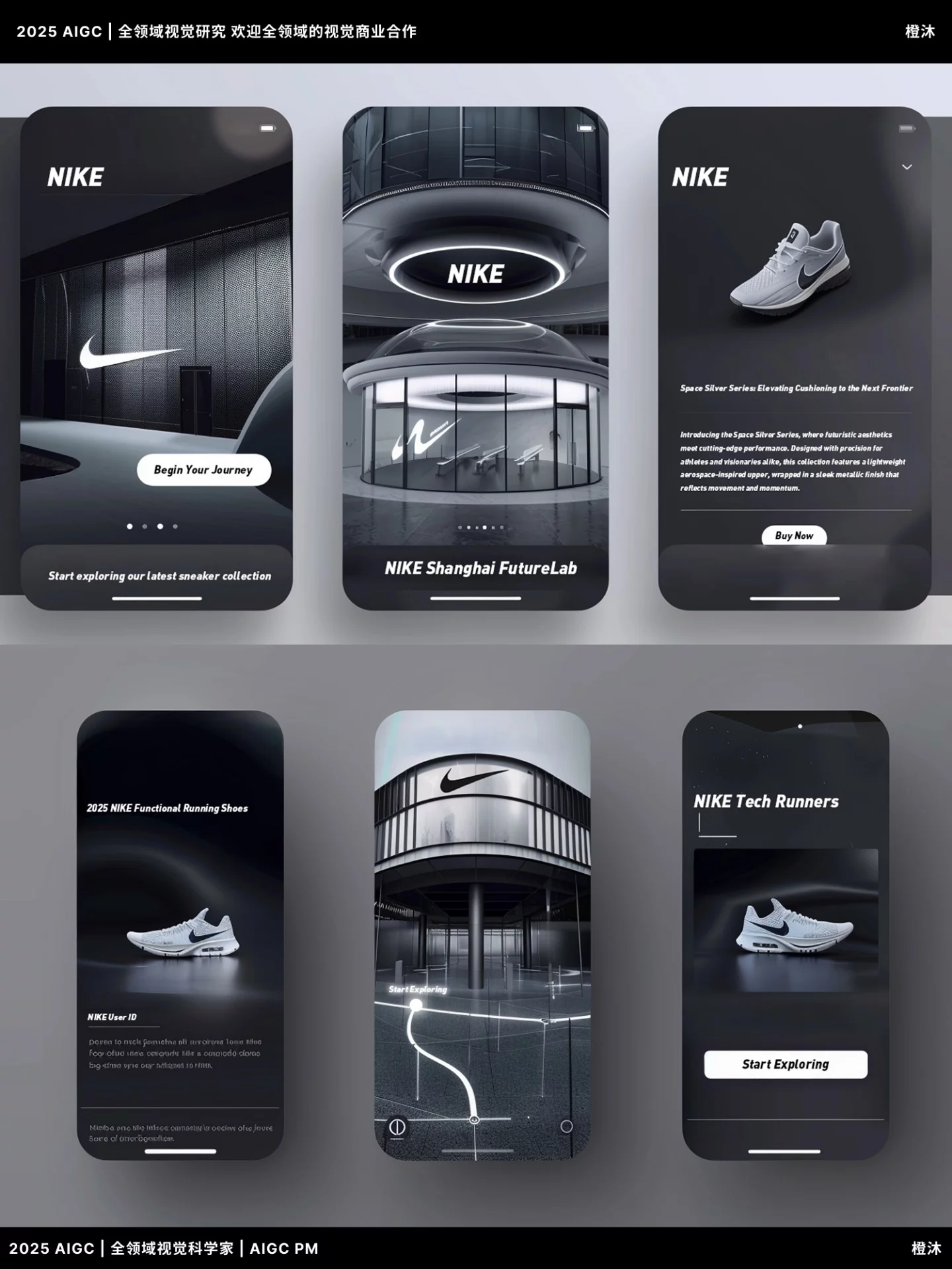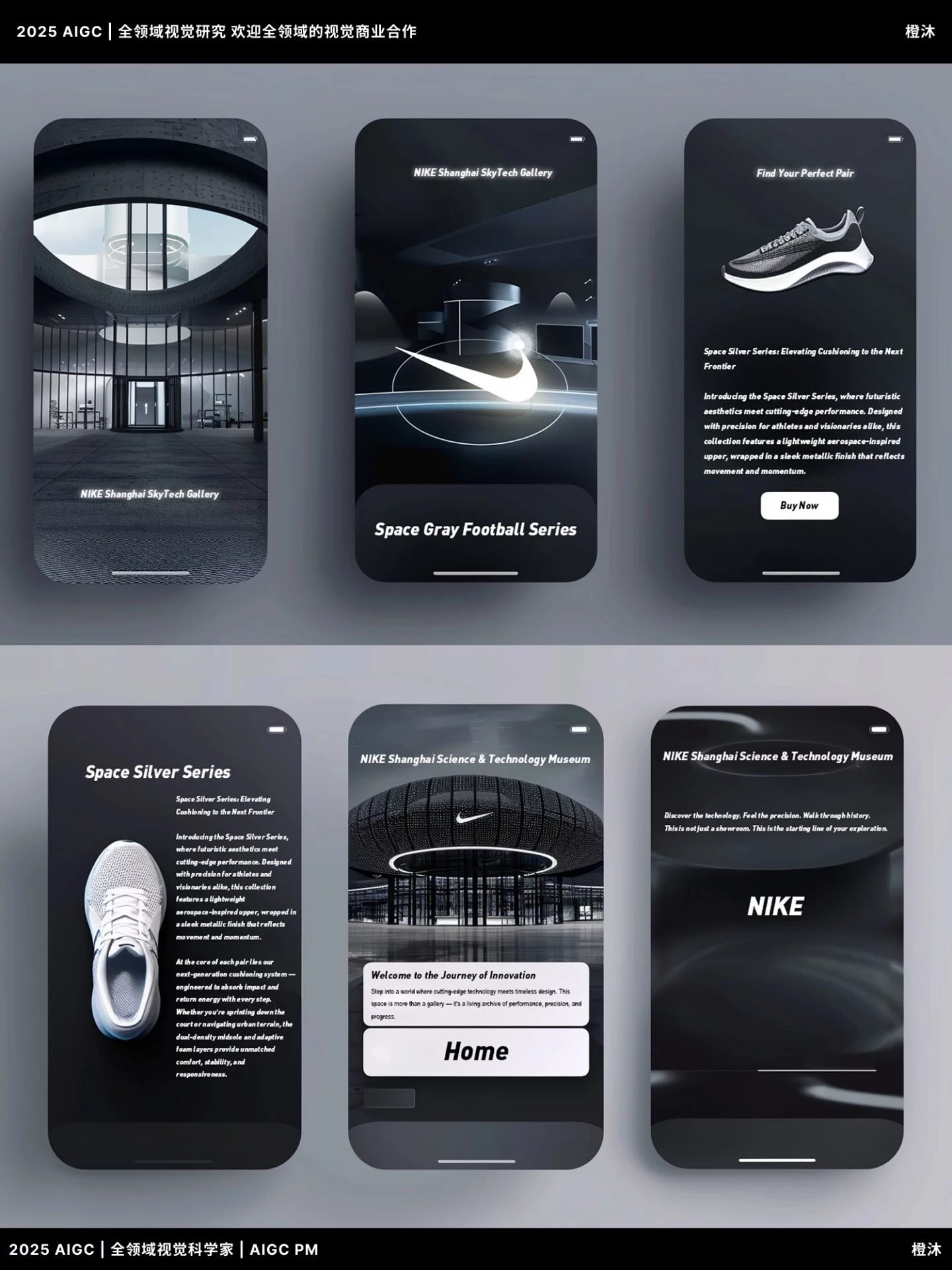 这组《NIKE Future Tech Hub》作品,是我基于 AIGC 图像生成能力所进行的一次跨领域视觉原型研究,聚焦于未来运动品牌场馆的构图机制、UI 语言及数字交互结构,并尝试在「建筑空间 × 品牌系统 × 科技感知」三者之间,建立一套可应用的视觉模型。