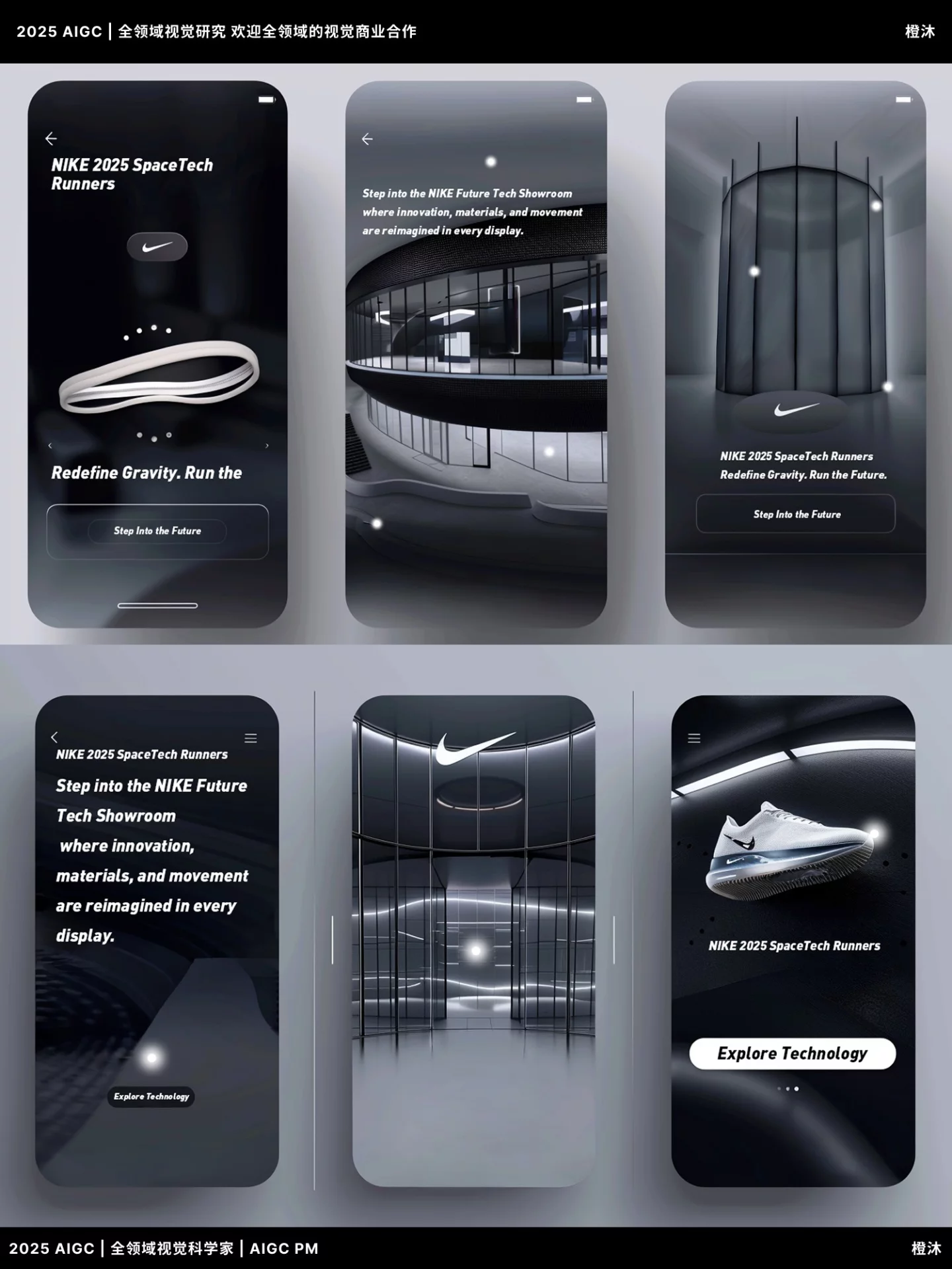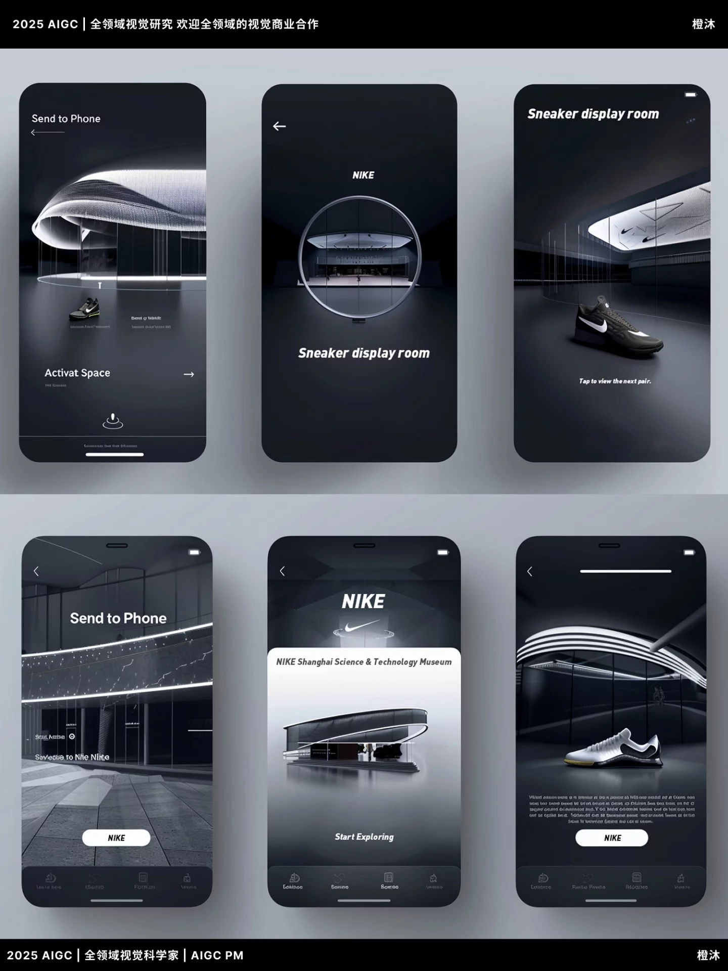 整组构图,融合发光边框、材质响应与动能层次,塑造冷峻理性又具探索感的品牌空间体验。NIKE 在画面中成为「隐性导航标」,贯穿 UI 与建筑路径。