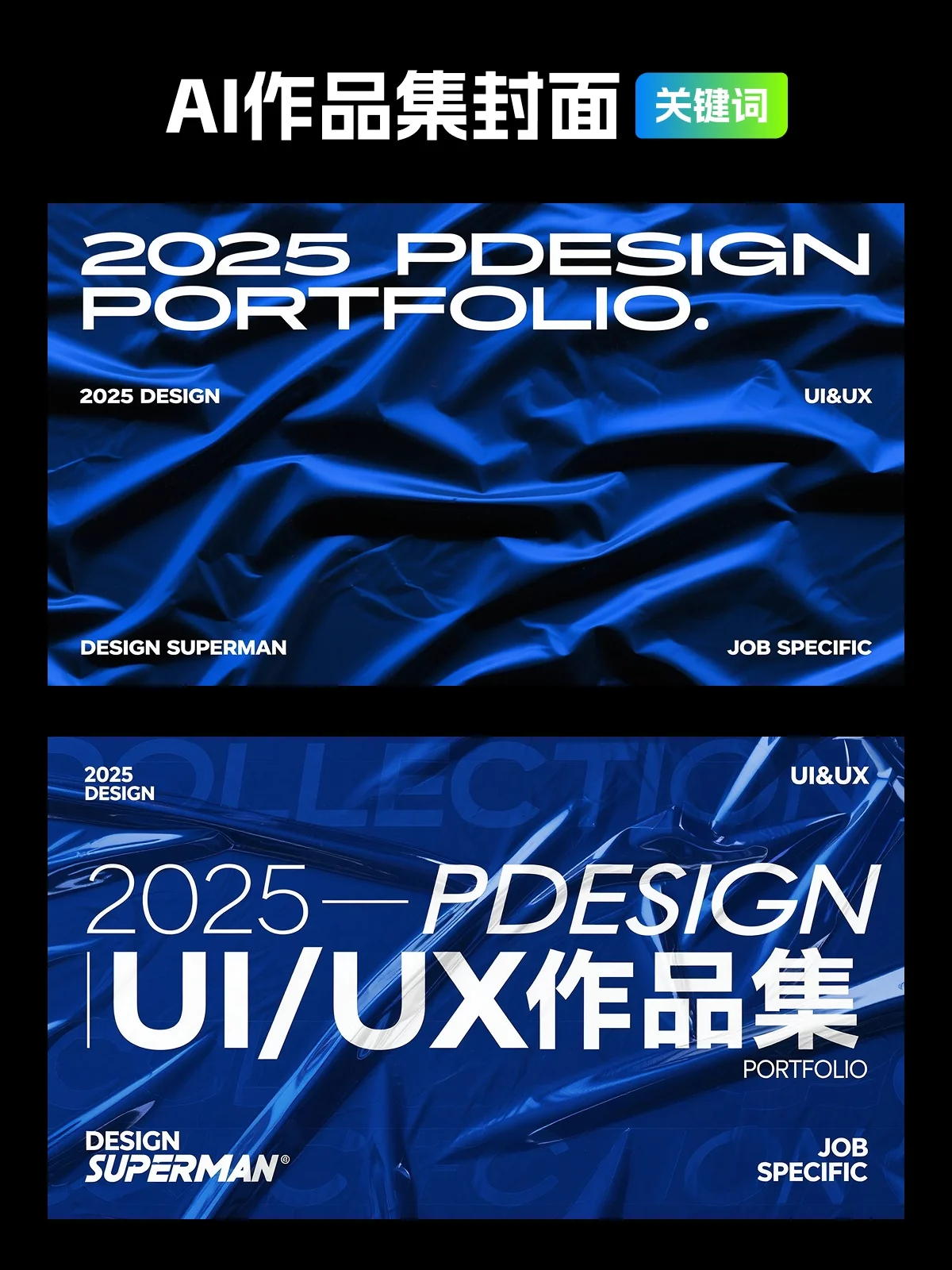 固定关键词:作品标题“2025 PDESIGN PORTFOLIO”,以及“UI/UX作品集”大字体呈现。左上角“2025 DESIGN”,左下角“DESIGN SUPERMAN”,右上角“UI&UX”,右下角“JOB SPECIFIC”