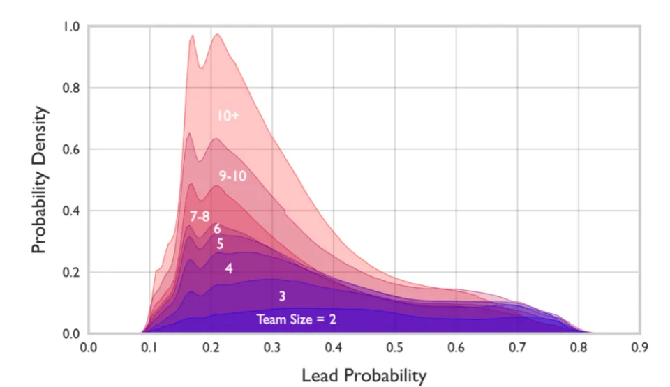 但是,研究人员同时指出:中国在绝对数量上迅速追赶美国、英国和欧盟的科学领导力的态势,掩饰了其在人均合作者项下可能较慢的追赶速度。研究人员计算了中国与各个合作伙伴区域的“领导溢价”,这一指标旨在以人均合作者项来衡量一个国家的科学领导力。结果发现,中国的“领导溢价”将在 2032 年至 2036 年之间和英国实现均势,在 2051 年至 2108 年之间与欧盟实现均势,在 2087 年之后和美国达到均势。