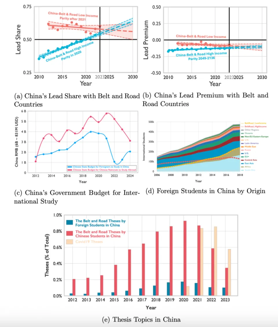 除了和美国、英国以及欧盟开展合作之外,研究人员发现中国正在与“一带一路”倡议签署过进行更深入的科研合作与人才发展。研究人员审视了中国与“一带一路”签署国之间的“领导份额”和“领导溢价”,发现加入这一倡议的国家非常多样,既有意大利、奥地利和新西兰等非常富裕的国家,也有一些发展中国家。本次研究发现,无论是与高收入“一带一路”国家相比、还是与低收入“一带一路”国家相比,中国在“领导溢价”上和它们即将达成均势,这说明中国在“一带一路”国家中的领导力趋势,并未脱离其和美国、英国以及欧盟相比时的领导地位。那就是中国拥有能够领导国际合作的顶尖科学家,但是目前较难在整个全球层面承担领导角色。