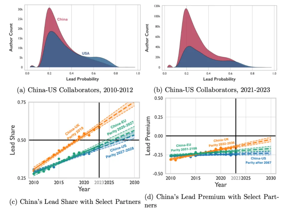 研究人员通过使用机器学习模型识别了 5966623 个跨国合作型科研团队。借此发现,在 1990 年至 2023 年间,中国科学家在绝对数量上大幅缩小了与美国、英国和欧盟科学家在领导力方面的差距。研究人员由此推测:预计在 2027 年至 2028 年间,中国和美国在双边合作中将拥有同等数量的团队领导者。