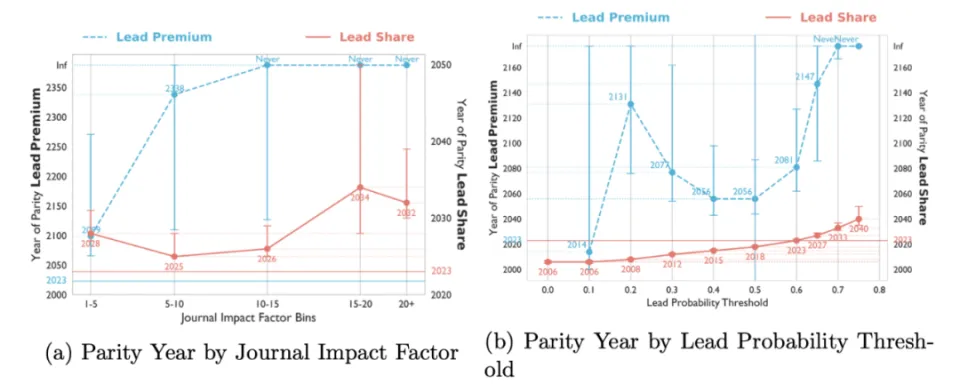 有一种观点认为,相比美国、英国和欧盟的科学家,中国科学家会在质量稍低的期刊上发表论文。针对这一观点,研究人员根据 2021 年的 Web of Science 影响因子针对期刊数据进行分组。针对不同影响因子的 5 个期刊分档,本次研究发现无论期刊影响因子如何,中国都将在 2034 年之前和美国达到均势。但是,研究人员同时指出:“‘领导溢价’的点估计预测结果显示,中国在高影响力期刊上永远无法与美国达到均势。”这说明中国最顶尖的科学家要想在全球科学界起到领导作用依然任重道远。因此,研究人员认为:“关于中国科学领导力崛起的第二种可能性是,中国的增长可能仅限于‘中层领导者’,而像美国这样的西方国家仍会保留顶级领导者地位。”针对这种可能性研究人员做了进一步探讨,他们使用不同的阈值来定义到底何为领导者,并分别运行了模型。点估计预测结果显示,即使在最高阈值之下,中国也将需要花费二十年来与美国在“领导份额”上达到均势。但是,在“领导溢价”这一指标上,中国需要花费更久的时间和美国达到均势,研究人员甚至发现在最高阈值之下中国和美国永远无法达到均势。