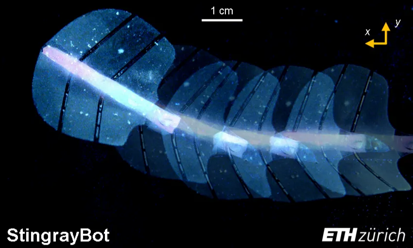 在第三个案例中,他们打造出一款仿生应用,即通过模仿黄貂鱼做出一个仿生游动机器人。该机器人拥有两片对称的鱼鳍,每片鱼鳍上都有不同尺寸的气泡阵列。在扫频激活时,凭借快速的响应能力,机器人可以模仿黄貂鱼鱼鳍的波动来进行推进。据了解,为了做成这款机器人,他们累计设计了 6 个样式、制作了 30 个模板和 60 余片样品,最终才做成了论文中所展示的应用场景。