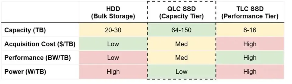 今年年中,Meta宣布与PureStorage合作,将QLC SSD引入数据中心架构,以取代部分HDD和TLC SSD。Meta认为,尽管TLC在写入密集型环境中仍具优势,但QLC拥有更高密度、更好能效和更低的每TB成本,足以承担“热数据”的一部分任务。