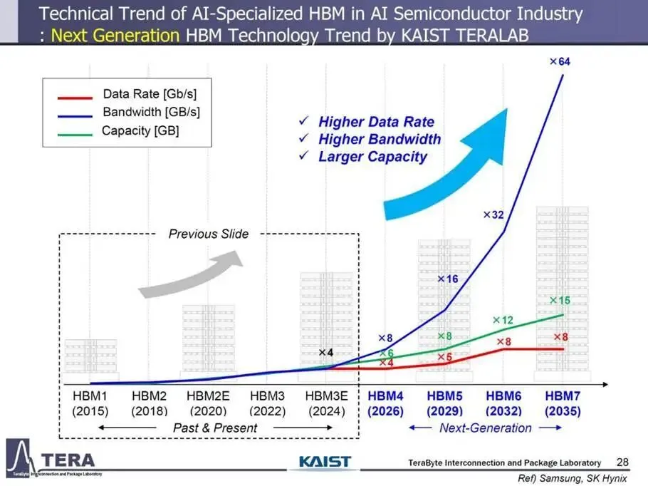 不断扩展的大模型,对带宽的追求也没有尽头。越靠近计算核心的内存,就越成为性能提升的关键。被称为“HBM之父”的金正浩教授,已经将HBM的路线图,规划至 2038年。从HBM4到HBM8,每一代都在推高带宽、速度与容量上限,其中带宽的提升尤为显著。