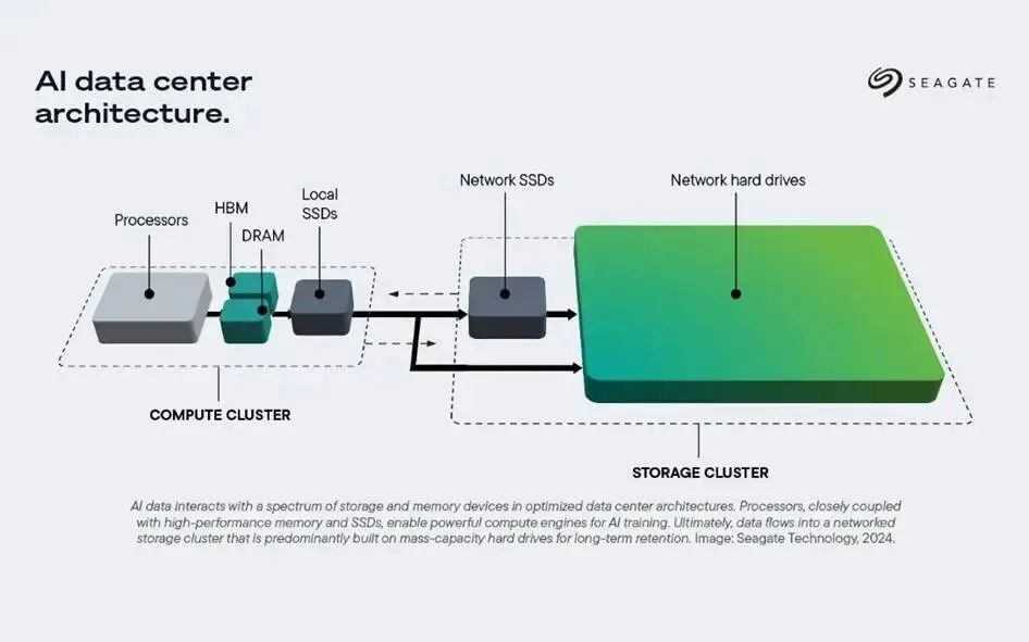 GPU或XPU等处理器,与HBM/DRAM紧密耦合,从而构建出强大的计算集群(Compute Cluster)。越靠近GPU,数据就越“热”,也就越需要更高的带宽与更低的延迟。最终,这些数据会流入一个基于HDD(机械硬盘)或SSD(固态硬盘)构建的网络化存储集群(Storage Cluster),“冷却”下来,用于长期保存。它们容量更大,成本更低,速度则会更慢。