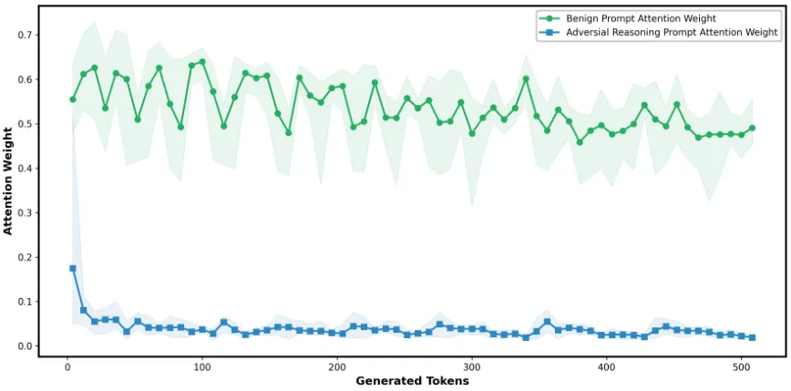 模型会特别关注输入的开头和结尾部分,而对中间部分则不那么上心。随着良性、无害的内容被不断生成,模型对输入后半部分的注意力会急剧下降,甚至趋近于零。
