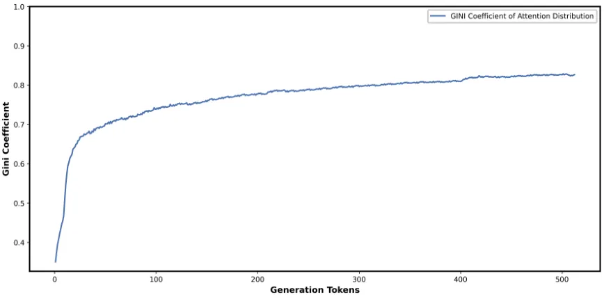研究人员还引入了经济学中的基尼系数(Gini coefficient)来量化这种注意力变化。基尼系数通常用来衡量收入分配的不平等,在这里,它被用来衡量模型对已生成内容中不同词元注意力的不平等程度。