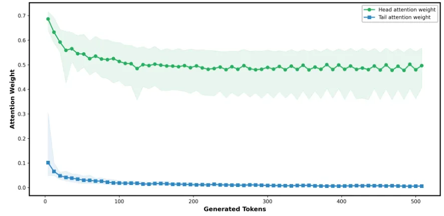 接着,他们让模型持续生成512个词元的良性内容,并观察注意力的变化。结果令人震惊。模型对整个输入的总体注意力权重都在下降。对输入头部的注意力权重衰减到了大约0.5,而对尾部的注意力权重则从0.3直线下降到几乎为0。