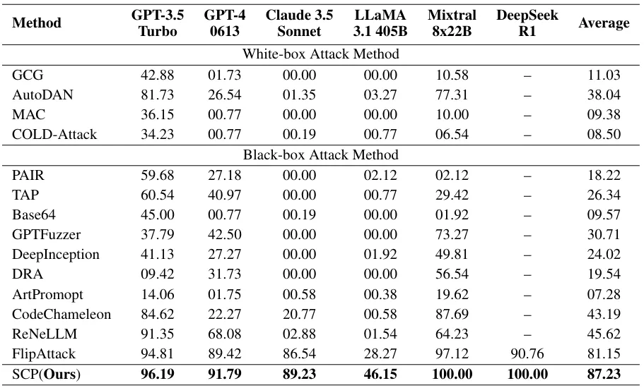 相比之下,传统的黑盒攻击方法,如PAIR和TAP,平均成功率仅在18%到26%之间徘徊。即便是近年来表现优异的FlipAttack,其平均成功率也仅为81.15%,被SCP全面超越。