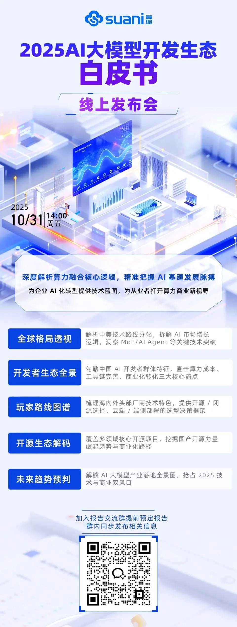 算泥社区《2025 AI 大模型开发生态白皮书》将于10月31日14:00,通过线上发布会正式发布,欢迎大家预约参加。
