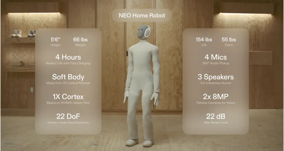 在硬件层面,Neo的每只手都有22个自由度,电池寿命为四小时,可承载最多55磅并能举升至 154 磅。其计算平台是基于强大的 NVIDIA Jetson Thor 的1X Neo Cortex,可提供 2070 FP4 TFLOPS 的AI计算能力。此外,该机器人配备了四个麦克风、三个扬声器和用于视觉的鱼眼摄像头作为接收器。